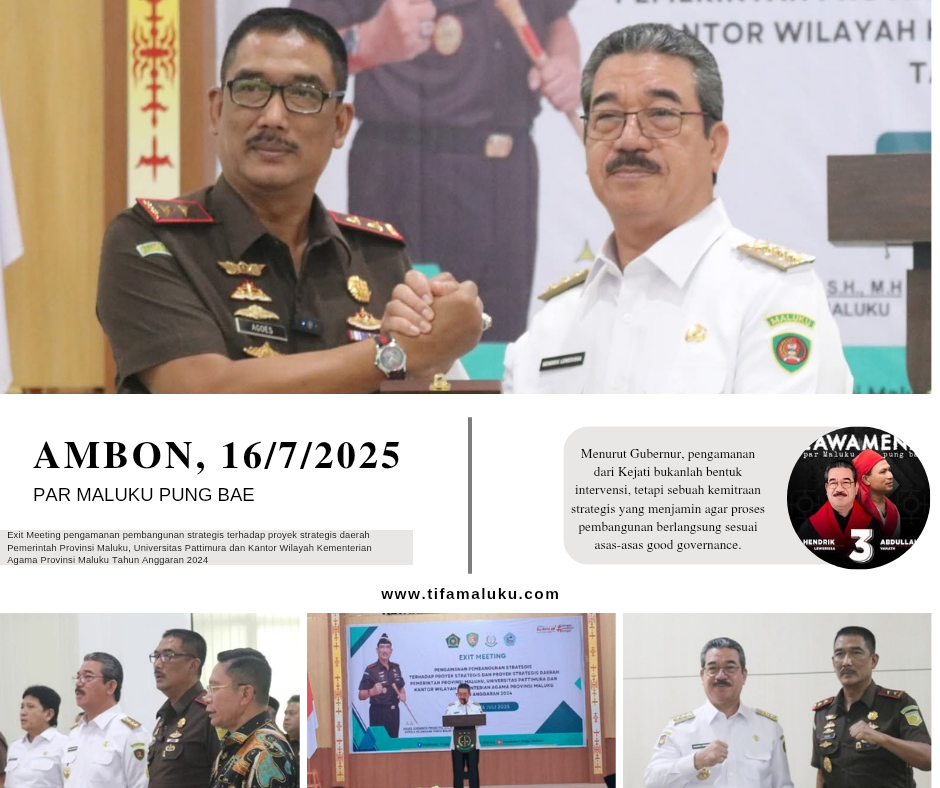 Exit Meeting ini menjadi penegasan bahwa pembangunan di Maluku tak hanya dituntut selesai, tetapi juga harus berkualitas dan memiliki dampak langsung bagi masyarakat. Kolaborasi antara eksekutif dan aparat penegak hukum pun menjadi fondasi utama dalam menciptakan pemerintahan yang bersih dan dipercaya rakyat. (TM-08)