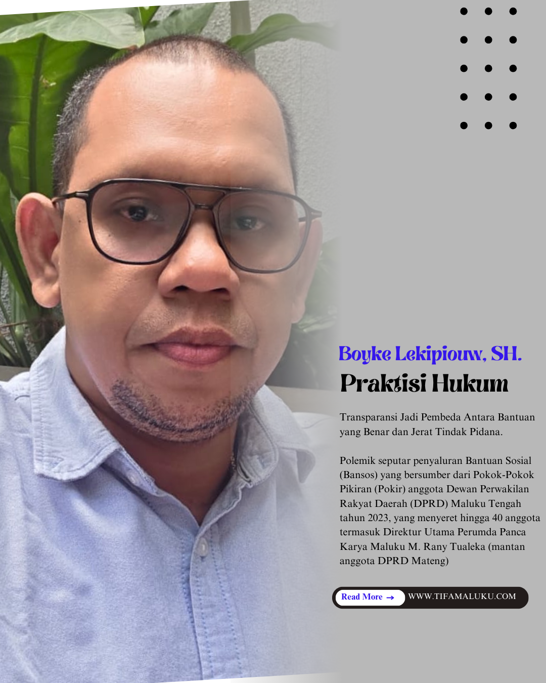 TIFA MALUKU. COM – Polemik seputar penyaluran Bantuan Sosial (Bansos) yang bersumber dari Pokok-Pokok Pikiran (Pokir) anggota Dewan Perwakilan Rakyat Daerah (DPRD) Maluku Tengah tahun 2023, yang menyeret hingga 40 anggota termasuk Direktur Utama Perumda Panca Karya Maluku M. Rany Tualeka (mantan anggota DPRD Mateng), mendapatkan pencerahan hukum yang tajam dari praktisi hukum Boyke Lekipiouw, SH.