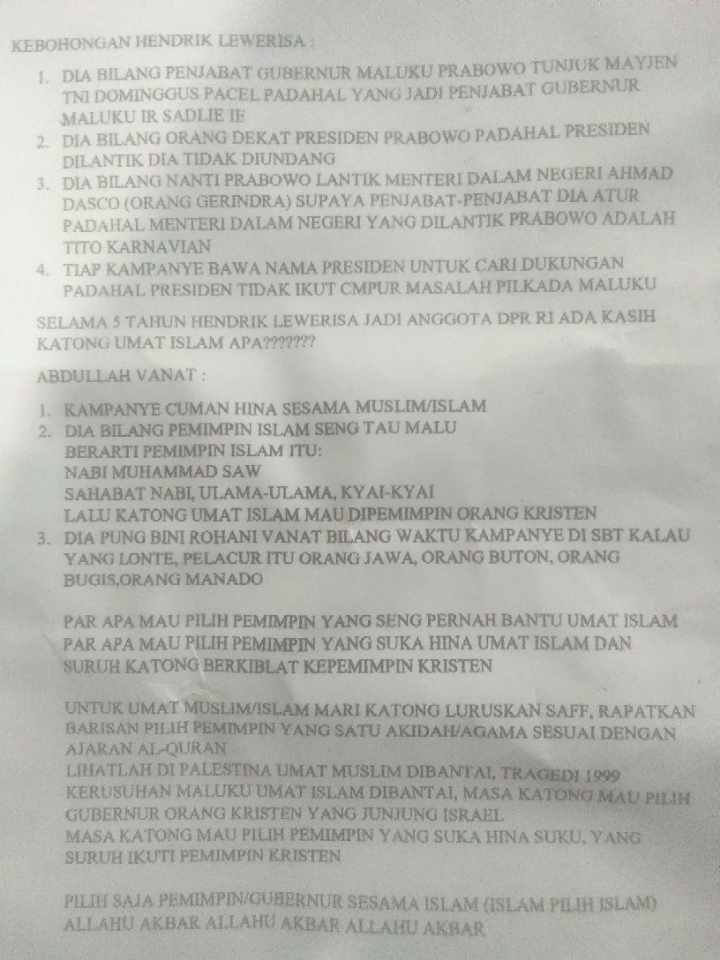 Upaya yang dilakukan oleh oknum-oknum dari Paslon lain yang tidak bertanggung jawab, untuk menjatuhkan pasangan calon Gubernur – Wakil Gubernur, Hendrik Lewerissa – Abdullah Vanath nomor urut 3.